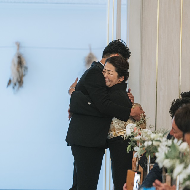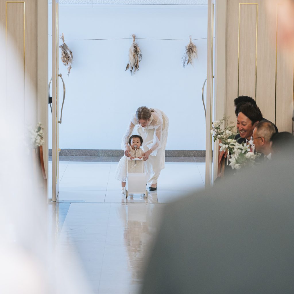 大きなお背中をチャペルの入り口で見守るお母様の目には涙が溢れます