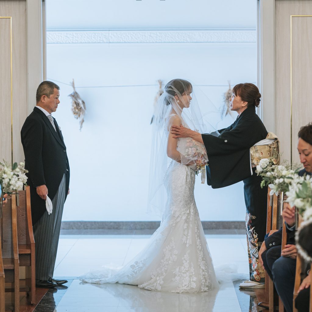 新婦様はお父様お母様に最後の身支度を整えていただき