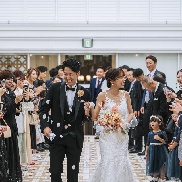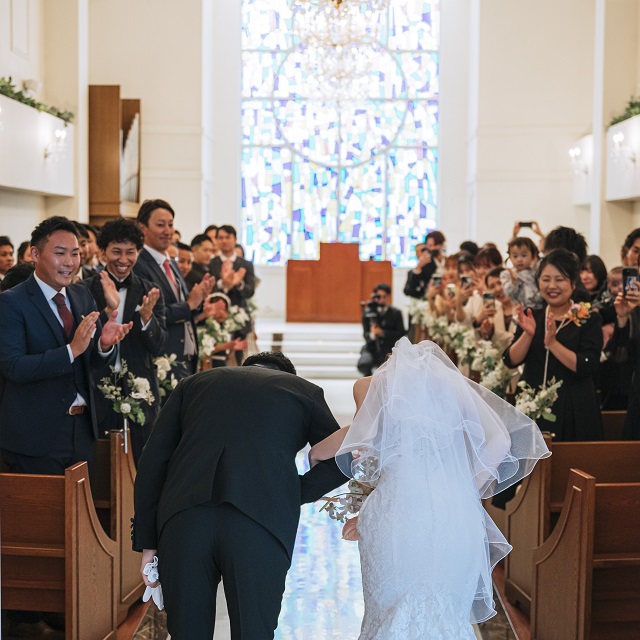 皆様からの賛同と祝福の拍手で見送られながらチャペルを後にするおふたり