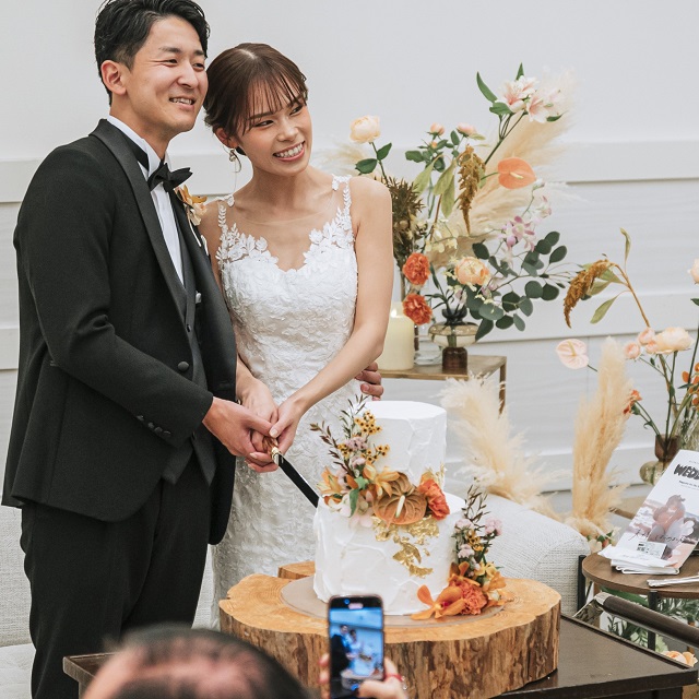 ケーキ入刀では、シンプルながらもおふたりの会場コーディネートに合わせた