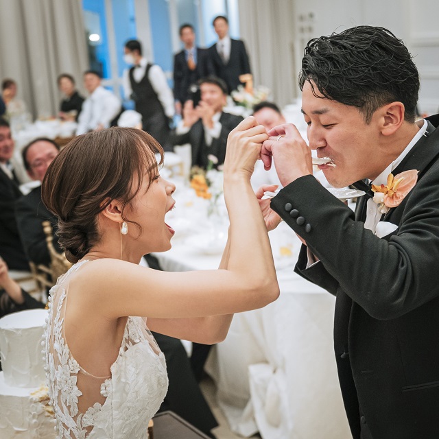 ファーストバイトでは大きなスプーンで新郎様に「おいしい料理をたくさん作るね」と