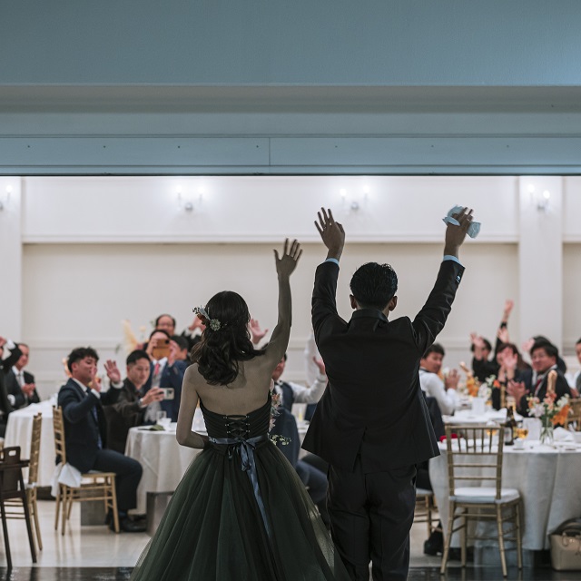 皆様チャペル側に注目をする中、おふたりが登場したのはなんと式場の入り口側!