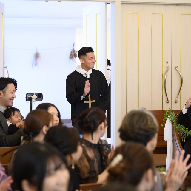 おふたりの入場が完了すると、今度は牧師役のご友人が入場!