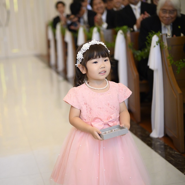かわいいピンクのドレスに身を包んだリングガールの登場です!