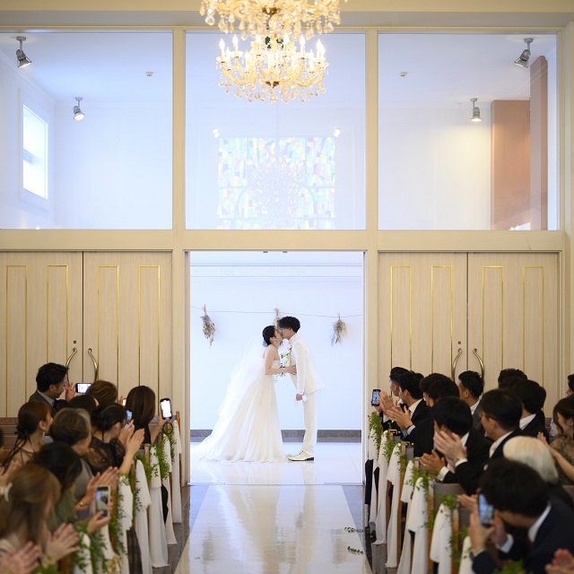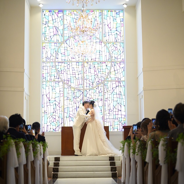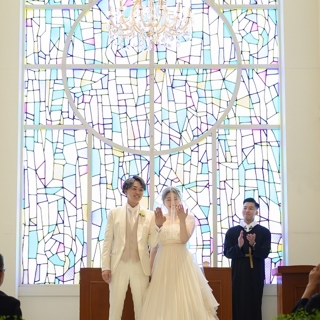 真っ白な内装にカラフルなステンドグラスが映える挙式会場にあわせた