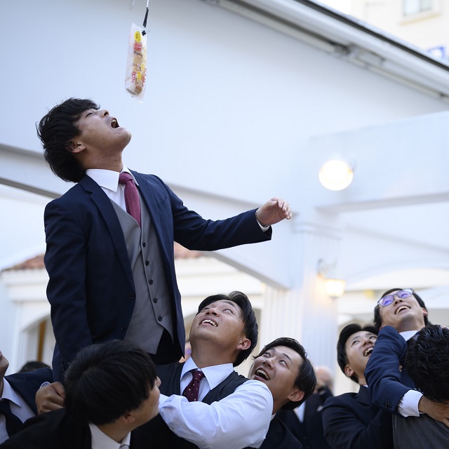 男性ゲスト全員でパン食い競争を行いまるで運動会のような盛り上がりを見せたガーデンセレモニーとなりました♪