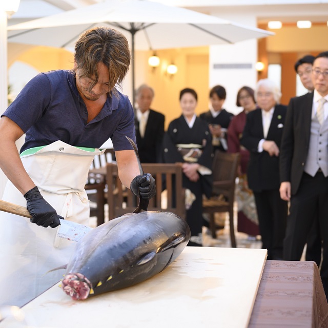 ウェディングケーキではなくマグロの入刀&解体ショーをえらび、
