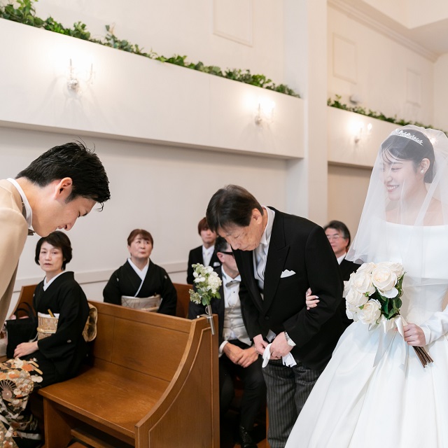 固い握手を交わして新婦様を新郎様の元へエスコートするお父様