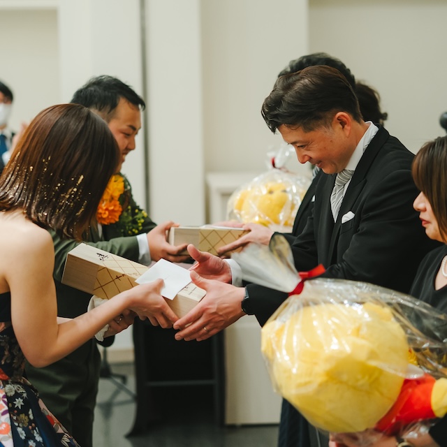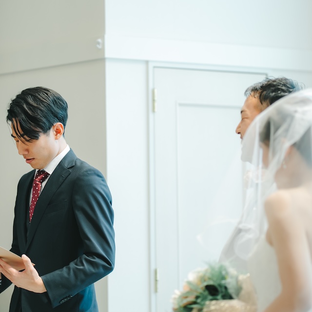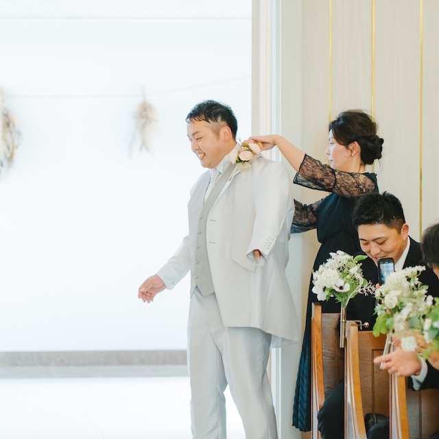 新郎様はお母様にジャケットを、お父様にはグローブを託され