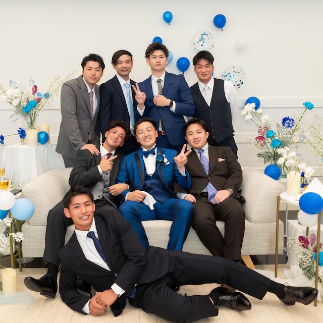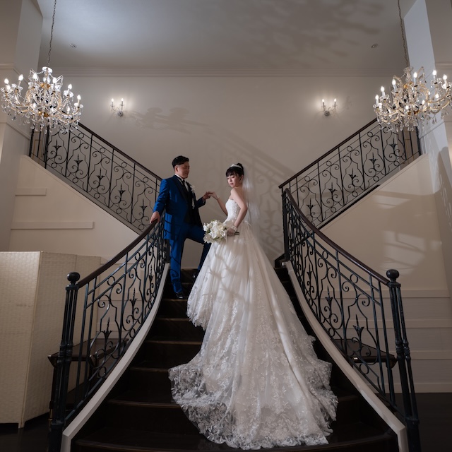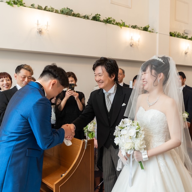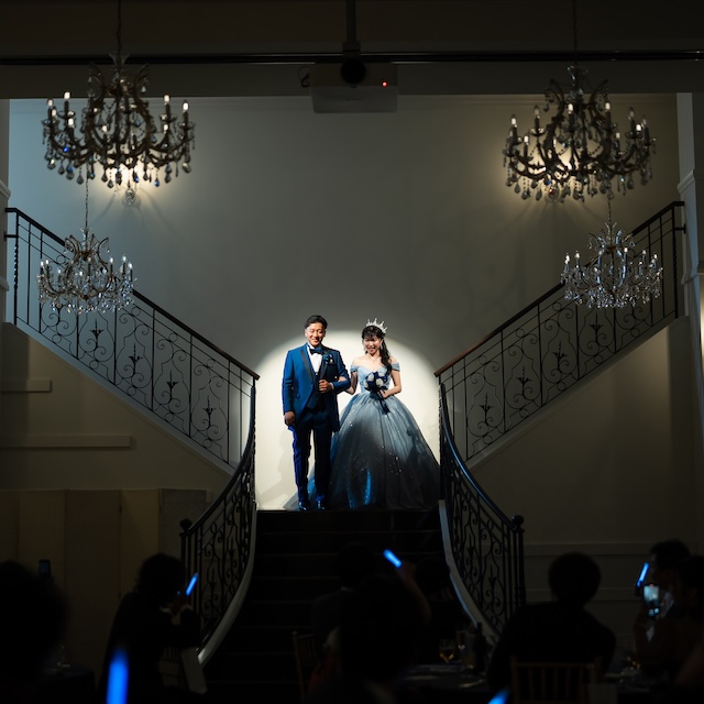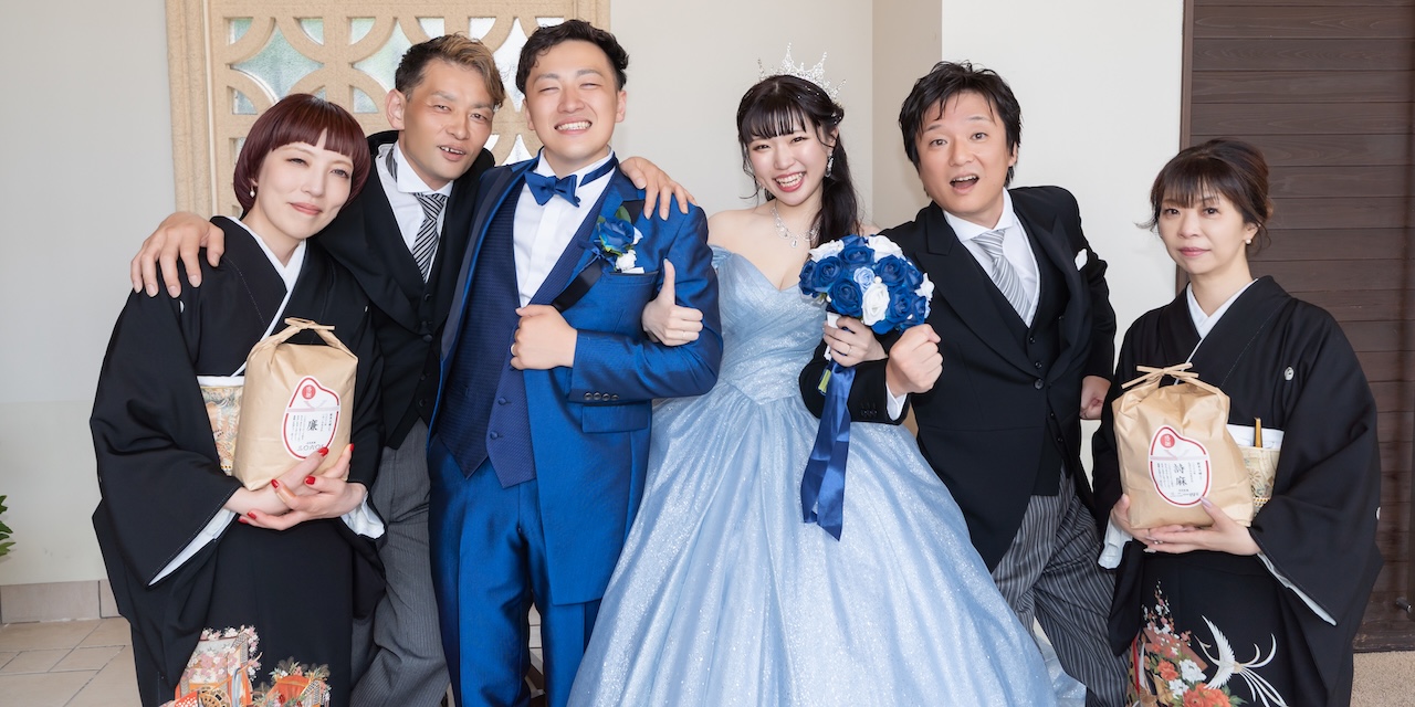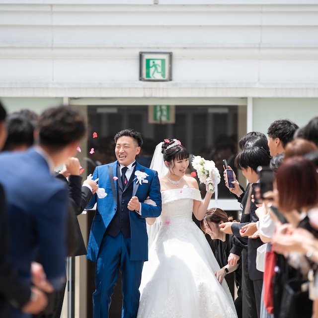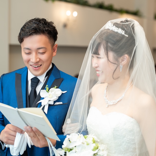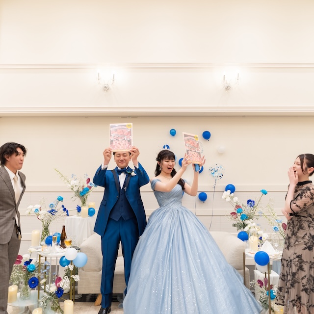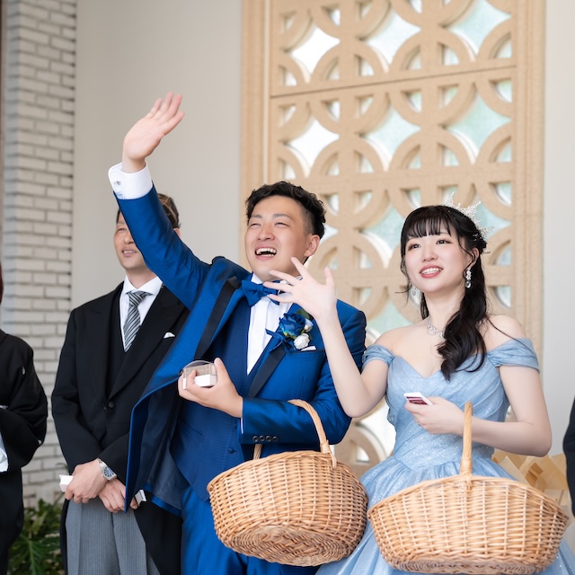 真っ青なタキシードと真っ白なウェディングドレスに身を包んだおふたりは、
