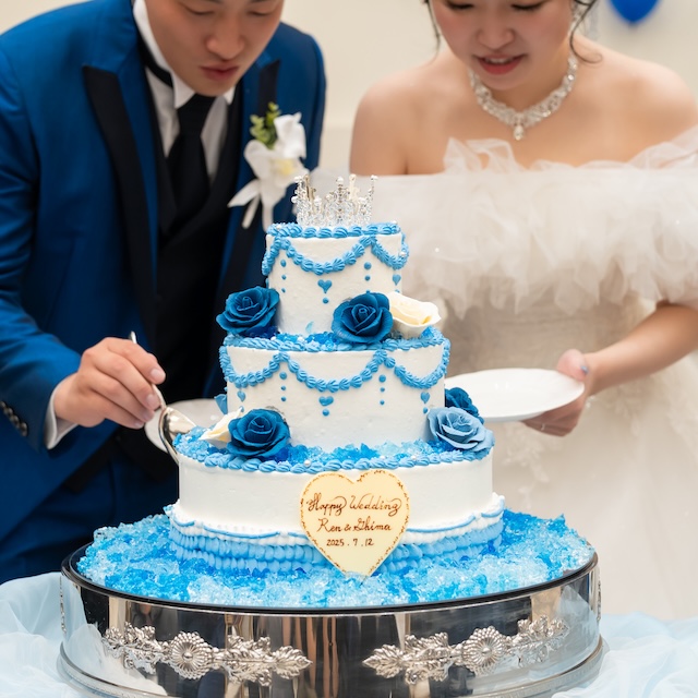 するとおふたりオリジナルのブルーとバラをモチーフにしたウェディングケーキが登場!