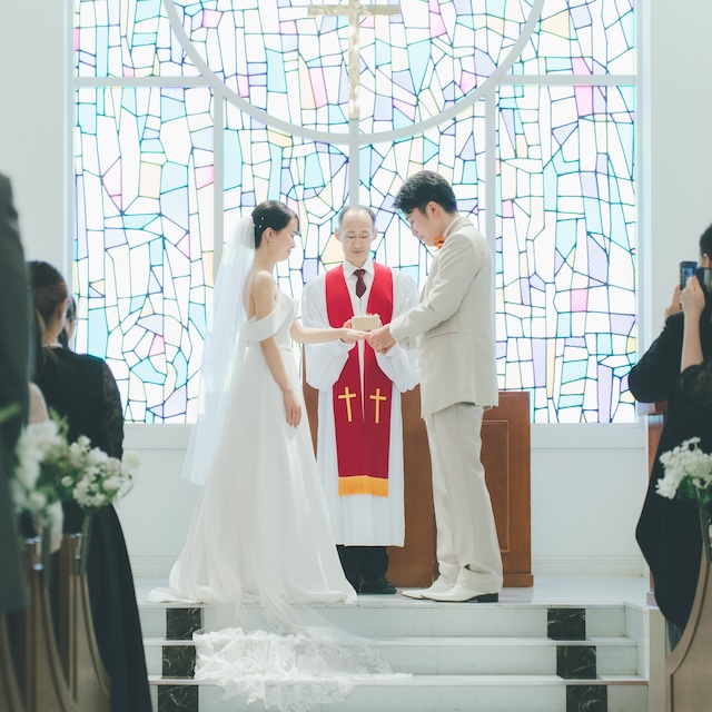 讃美歌斉唱・聖書朗読・誓約・指輪の交換を行い、皆様にご披露