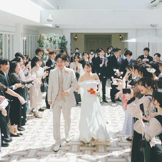 ゲストの皆様の長いアーチから、たくさんのご祝福のお声と笑顔で新郎新婦様も素敵な笑顔に包まれます